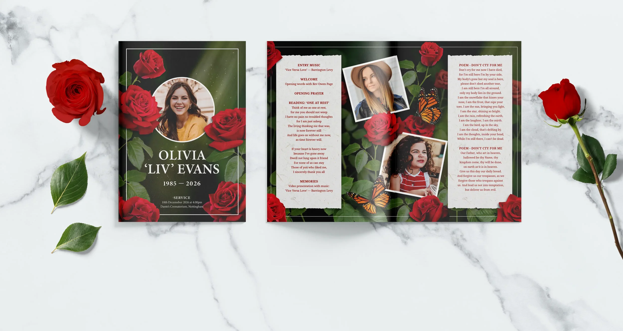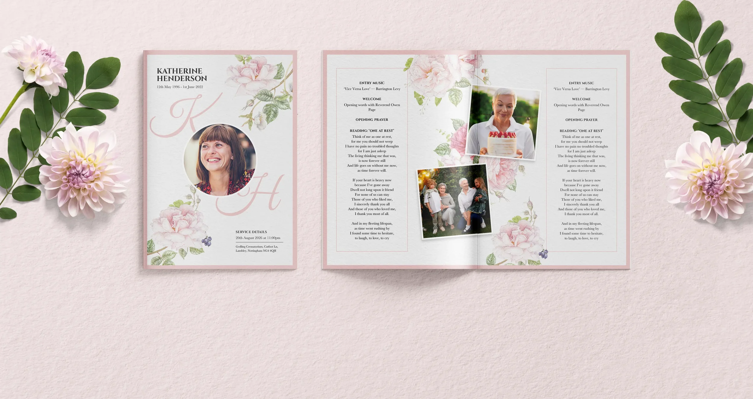 Beautifully designed and professionally printed 4, 8, or 12-page A5 Order of Service booklets, personalised to celebrate your loved one’s life with dignity and care.