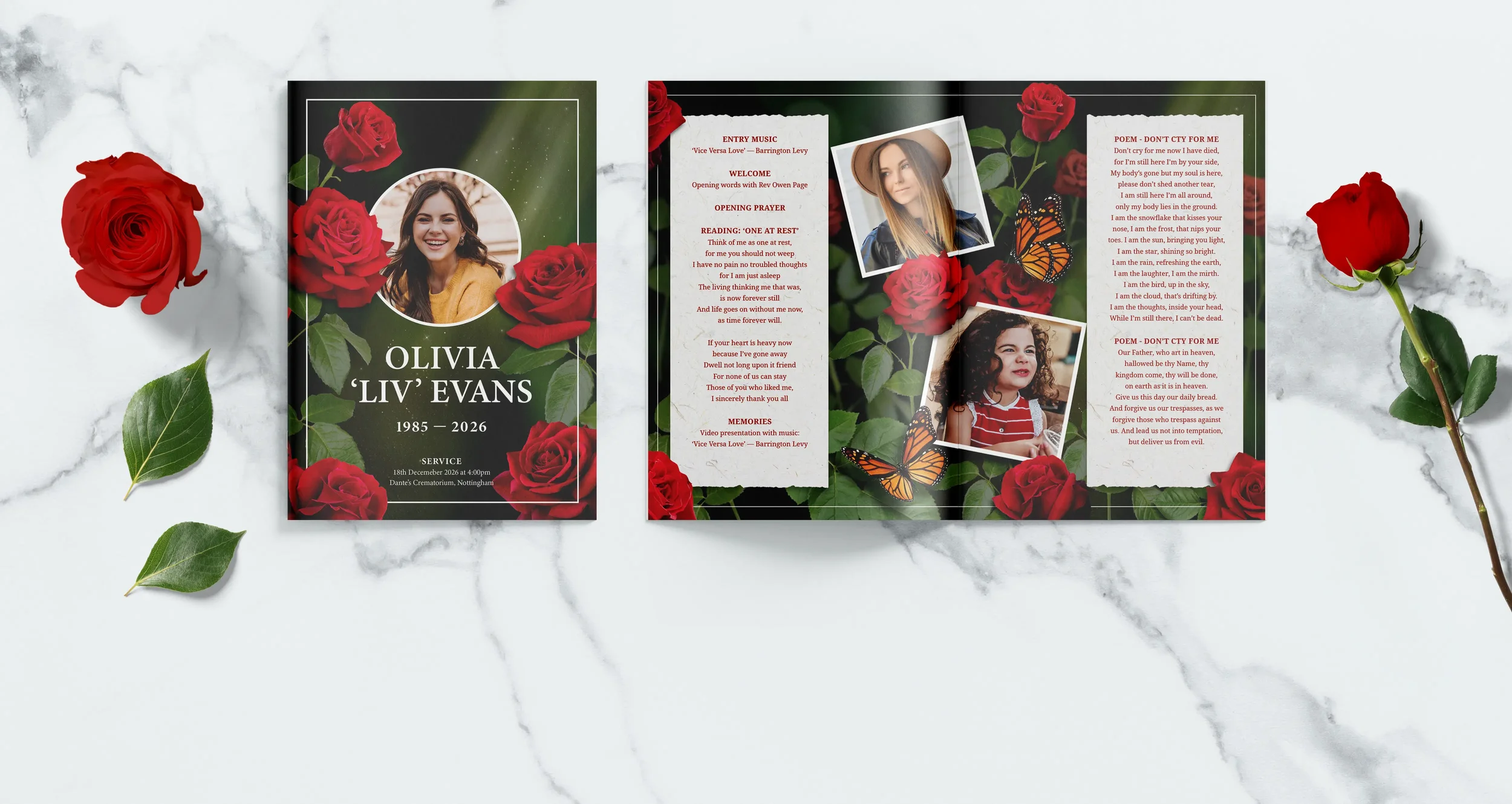 A5 is the perfect pocketable size — compact enough to slip into a bag or jacket pocket, but with plenty of room for photos, readings, and memories. It’s a thoughtful, elegant format that guests can keep and treasure.