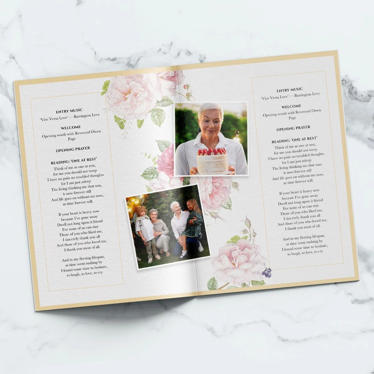 • Customise online – Open the template in Canva and edit names, dates, photos, readings, hymns — anything you need.
